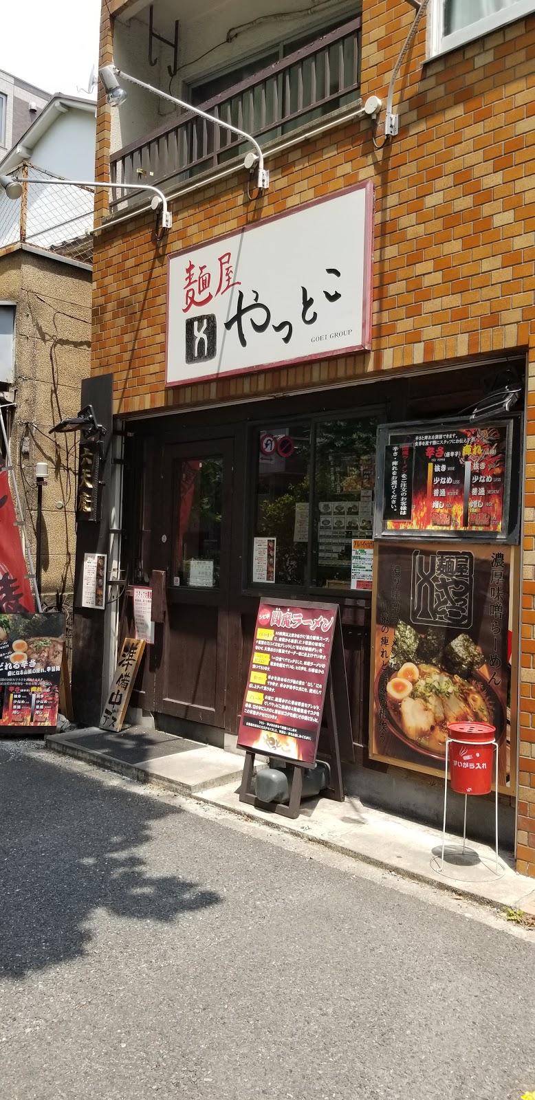 こちらは、2010年7月に創業した、豚骨の有名店「麺の坊砦@神泉」出身の店主がオープンした『三代目 やっとこ 六天魔』の中野店。場所は、青梅街道沿いで中野警察署の並び。最寄り駅は都営大江戸線、東京メトロ「中野坂上」駅から徒歩10分くらい。平日12時過ぎに再訪。ランチタイムには数人並ぶこともあり、カラシビラーメンと二郎系ラーメンが看板メニュー。外待ちなし。入店して左手の券売機で○ 閻魔ラーメン ¥880○ 麺量 大盛 ¥130をポチッて、空いていたカウンター席へ。店内は、カウンター7席とテーブル席。購入した食券の辛さ、痺れの欄にそれぞれ抜き、少なめ、普通、増し、激増し(+100円)に○をつけてスタッフに渡すシステム。今回は、○ 辛さ増し、痺れ増しでオーダー。セルフでボトルの冷水を入れて、待つこと10分弱で着丼。「鬼金棒」によく似たビジュアル。100%国産の豚骨鶏骨ベースの粘度高めのスープ。スープの上には軽く炒めたシャキシャキ感のあるモヤシ、さらに少量のネギがトッピング。その上から唐辛子らしき赤い粉末。麺は、自家製の太麺。加水率が高く、口当たりの滑らかさと、モチモチとした食感が特徴。スープとの絡みも良く、喉越しも良くて美味い。豚はバラ煮豚の角煮形状。歯を入れなくてもホロリと崩れる柔らかさ。閻魔ラーメンという名称だが、辛さ増しでも、しっかり旨みも感じられる。途中から卓上の生ニンニクを投入すれば、さらに深みのある味わいになって美味い。次は二郎系のG麺を食べてみたい!!ご馳走様でした!