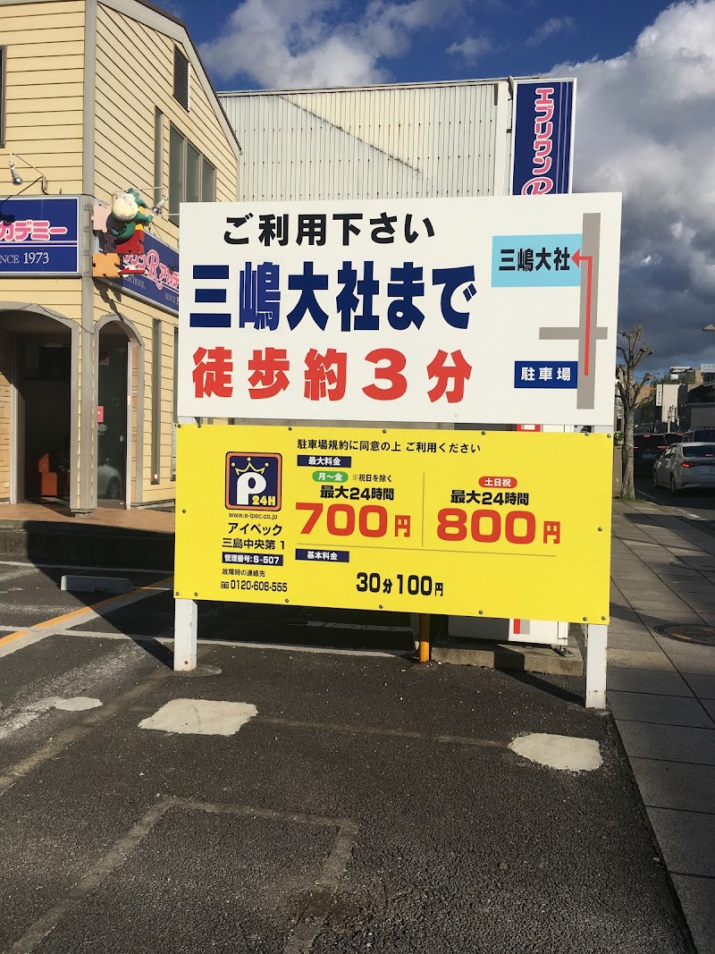 三嶋大社まで徒歩3分。30分100円。ちなみに三嶋大社の横の駐車場は1時間200円。