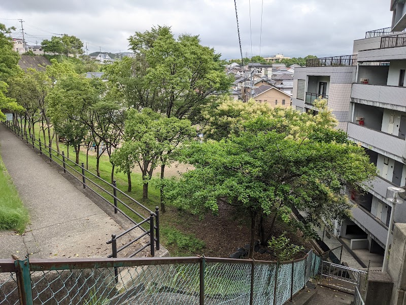 田辺市の住宅地である新万(しんまん)と南新万にまたがった公園です。新万と南新万の間は高低差があって、より高い新万側から運動場のある南新万側をつなぐスロープ状の歩道がついています。運動場にはブランコ、すべり台、ジャングルジムがあります。