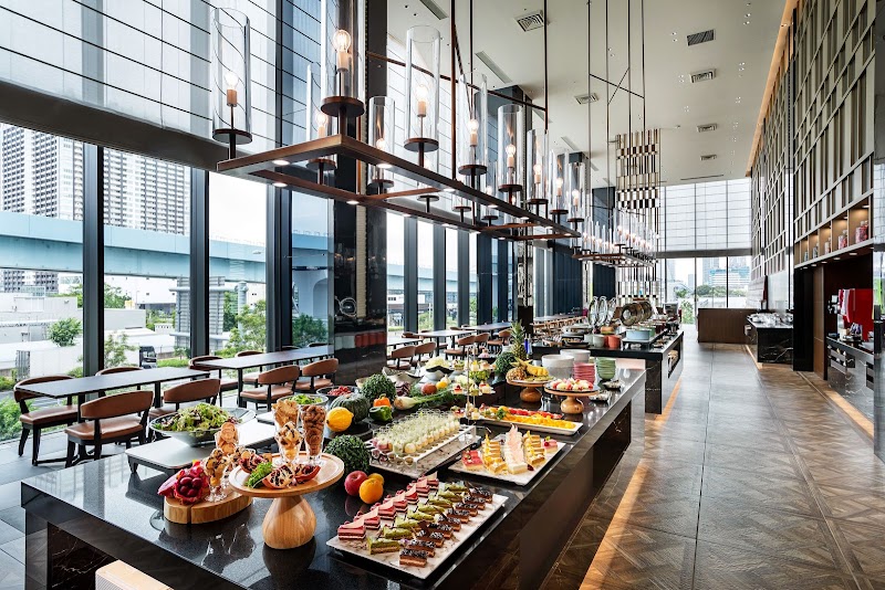 ゆりかもめの、有明テニスの森駅と、有明駅のちょうど中間付近。ホテル宿泊のため、朝食もついており、利用させていただきました。朝食は、ビュッフェ形式になっており、平日の7:15頃の利用だと、全体の1-2割程度しか埋まっておらず、食事を取るエリアのさらに奥に通していただきました。お店の作りが、入り口からみてかなり横長になっているため、食事を取るエリア近くに座れれば良いけど、入り口付近だと、少し遠い印象を受けました。客席としては、窓際と、内側は、少しテイストが違い、個人的には窓際が好みです。食事に関しては、よくあるサラダや、和風の煮物、スクランブルエッグ、ソーセージなどが並んでいました。特徴的なのは、海鮮が生のまま並び、海鮮丼が作れることと、パンが5種類ほど置いてあること、ライブキッチンで、パンケーキを焼いてくれることの3点があげられます。海鮮丼に関しては、豊洲市場が近いため、期待しすぎてしまい、まあまあ、よくあるレベルのように感じました。生ものを提供しているホテルは多くはないので、海外の方向けには良いかな?といった印象で、刺身を食べ慣れている人(私含む)には、美味しいレベルではないです。カマが焼いてあるものがあり、こっちの方が美味しかったです。刺身よりも、煮物のほうが、オススメ。ライブキッチンでは、抹茶のパンケーキを焼いていましたが、抹茶の味は濃くなく、抹茶風味のパンケーキです。