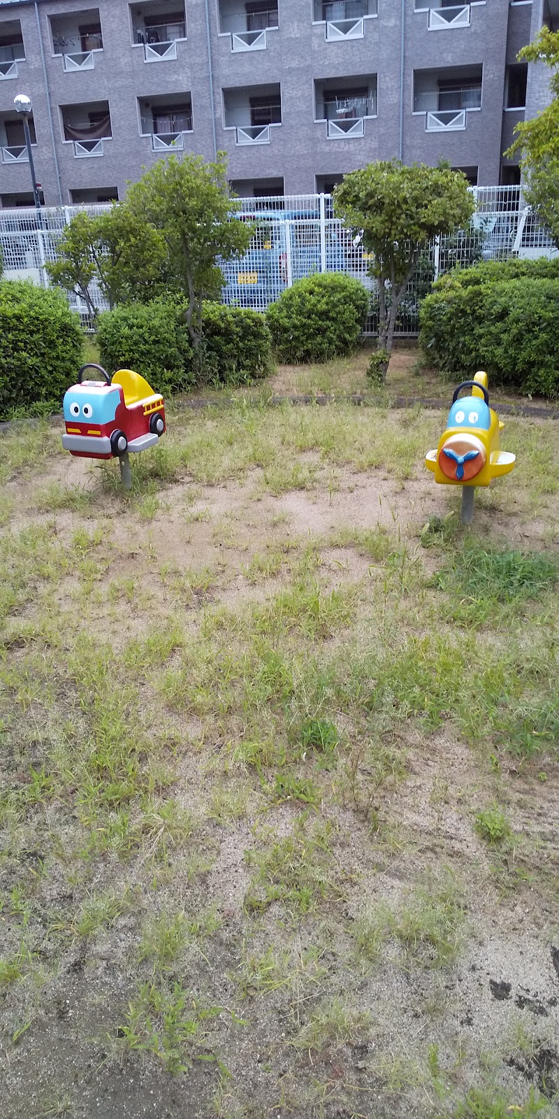 比較的大きい児童公園だマンションの敷地内に在る遊具とベンチが設置されている広いテラスや大小の植木が有りゆっくりと休める近くの道路は交通量が多いので注意が必要だ。
