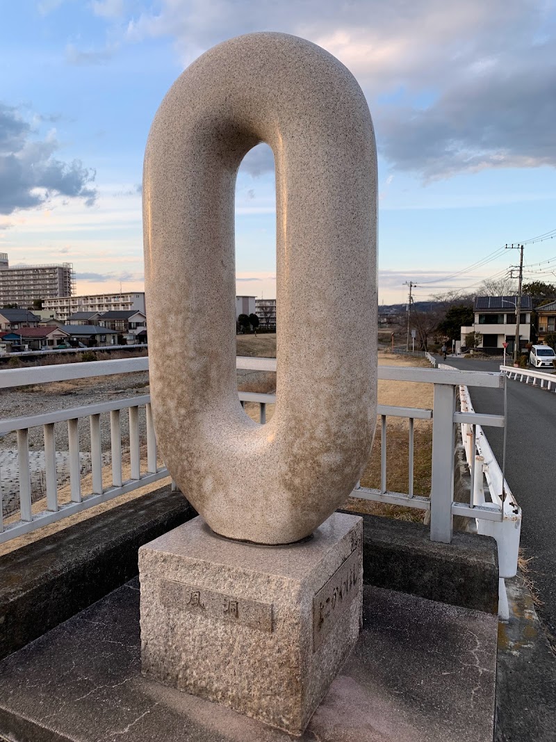 小さな橋の周囲に同じ素材でできた四つの彫刻がある。