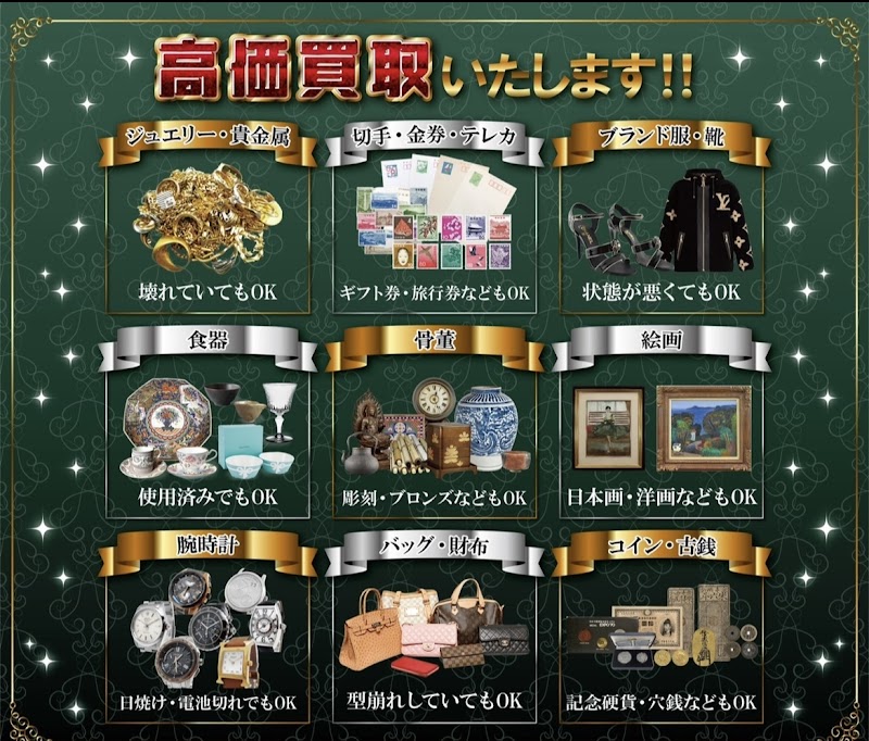 ふらっと立ち寄ったのですが、いつもお宝をたくさん発見することが出来ています。おもちゃ・婦人服・アクセサリー等、品揃えも豊富です。素敵なデザインの指輪や可愛らしいストラップ、息子の推しているポスターなど、さまざまなジャンルで掘り出し物が見つかって毎回楽しませて頂いております。